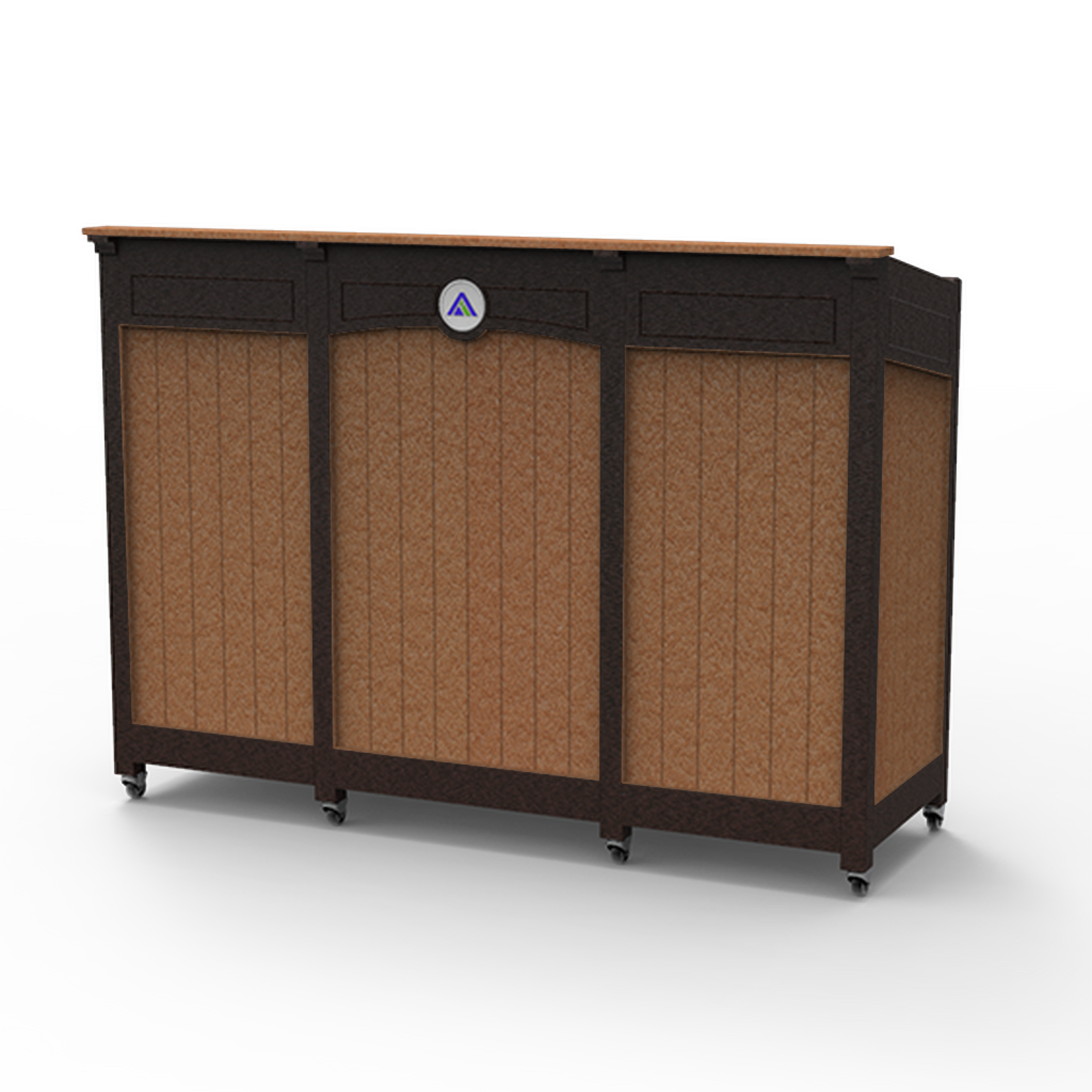 Commercial outdoor bars have angled side panels. Choose from two different configurations. Model PBAS includes (2) 25Qt. ice coolers with exterior drains, (2) speed rails, and interior lockable storage w. hinged door and casters (excludes waste receptacle). The PBA2S model includes (1) 25Qt. ice cooler with exterior drain, (1) speed rail, waste receptacle, interior lockable storage w. hinged doors, and casters. Great for parties, conventions, catering, fundraisers, and celebrations of all kinds. We’ve included a decorative accent panel and space for your logo along with our trademark routed panel design.