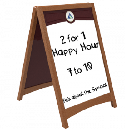 This sandwich board sign from our Signature Series includes dual-sided message panels, a durable support frame with stainless steel top hinge, and a unique decorative accent panel for your logo.