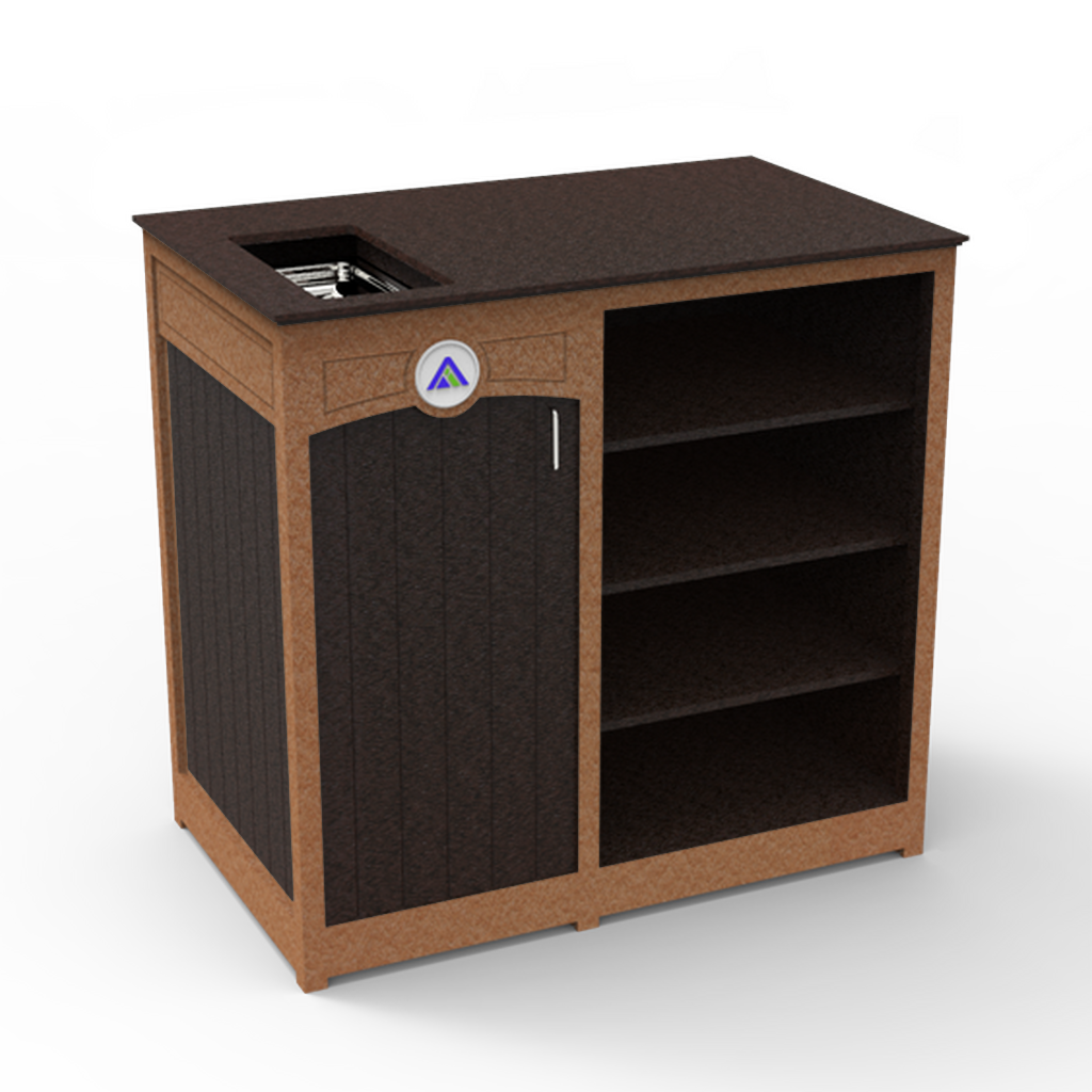 Suitable for fast food restaurants, cafeterias or institutional dining halls, this busser unit consists of a 28 gallon top load waste receptacle, magnetic silverware catch and storage for four 7” busser tubs.