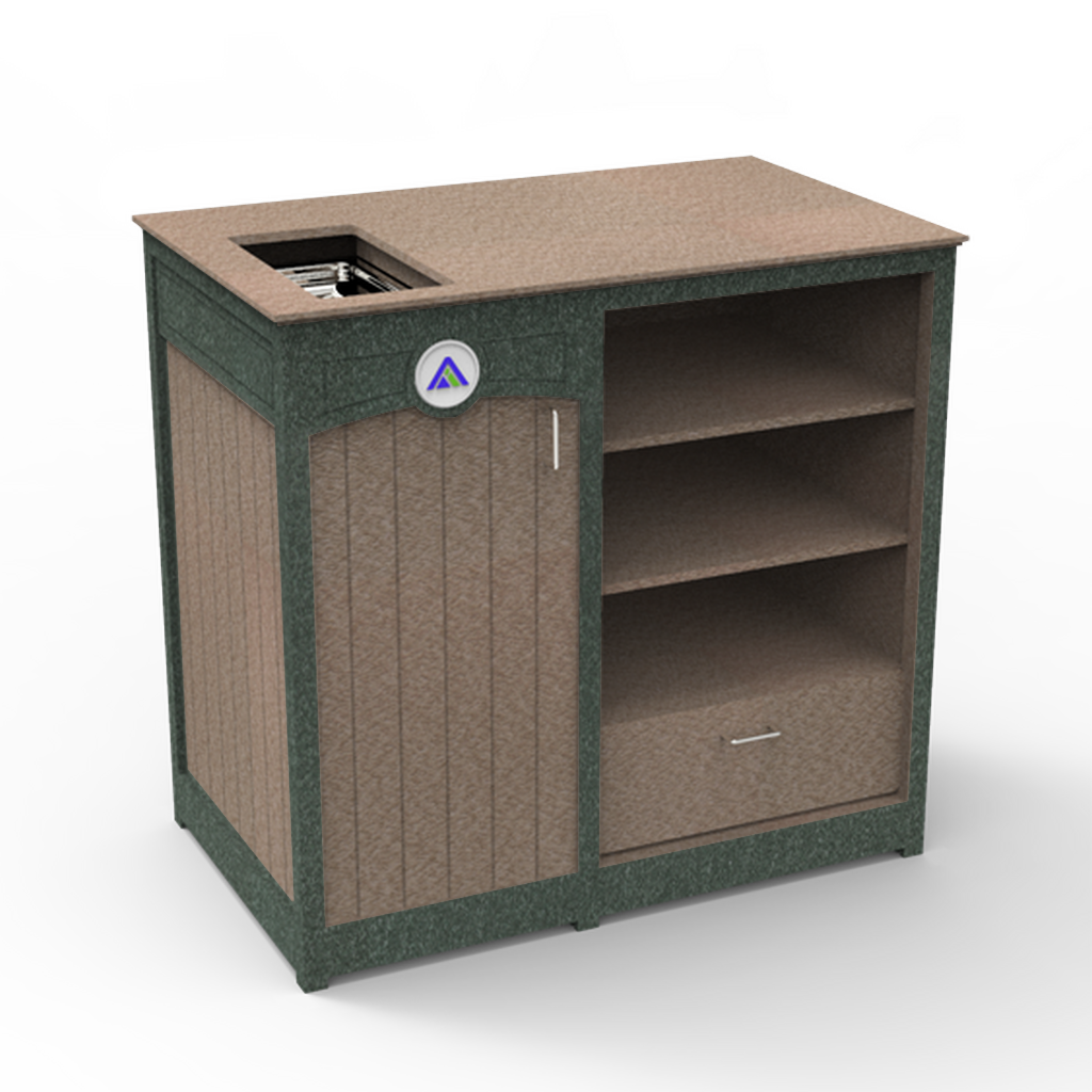Comparable to model FSB6T, this food service busser cabinet comes standard with a 28 gallon top load waste receptacle, magnetic silverware catch, storage for three 7” bus tubs and a drawer.