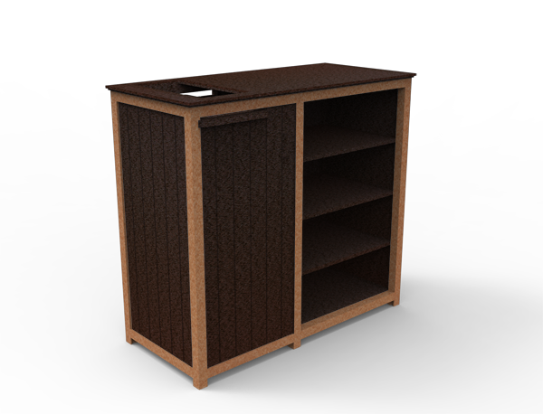 This restaurant busser unit consists of a 28 gallon top load waste receptacle, magnetic silverware catch and storage for four 7” busser tubs.