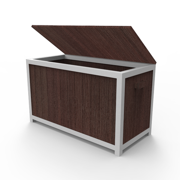 Pool storage box in garapa, ipe, Lamboo® or water-resistant recycled plastic. Modern Traditions Series design features attractive routed panels. Store pool supplies easily and conveniently with matching towel stations, waste & recycling receptacles and poolside furniture.