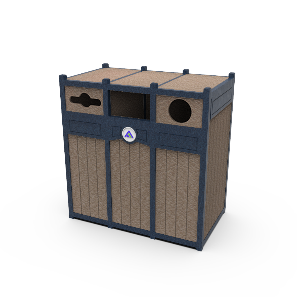 - Configurations — model pictured is a triple recycling station with included waste bin, but single, double, and quadruple units are also available.