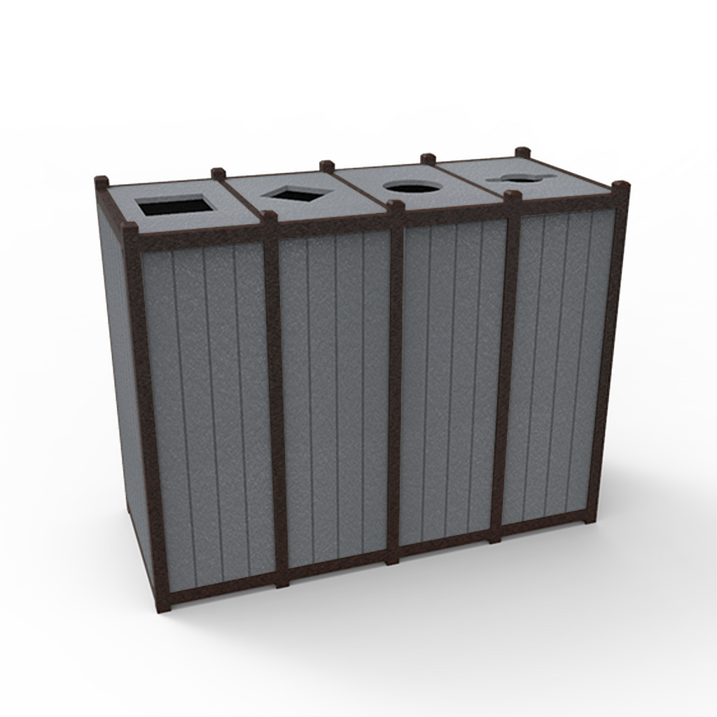 Large recycling containers are key if you’re committed to a mean, clean, green venue. Quadruple configuration allows you to select the number of waste and recycling receptacles you need, choose a descriptive label for each one, and specify restrictive openings in order to facilitate proper sorting.
