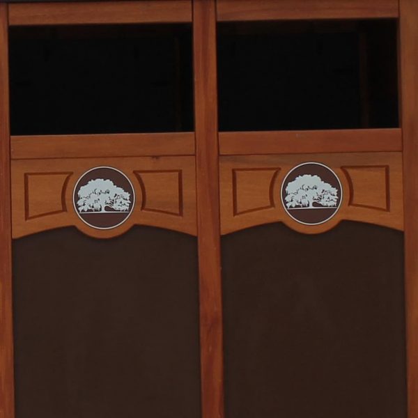 Waste and recycling container features solid brown panels and an arched cross-support wooden frame. Manufactured using eco-friendly recycled plastic, it resists mold and mildew. Stylishly designed for original use as a trade-show demo product.